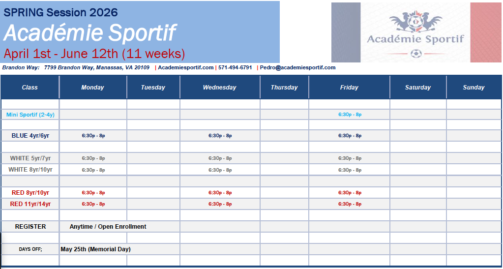 Sportif Red follows the methodology and training philosophy from the French National team. This competitive group focuses on achieving the highest level skills in soccer, 6-8yo and 9-11yo.